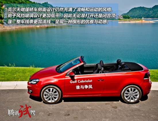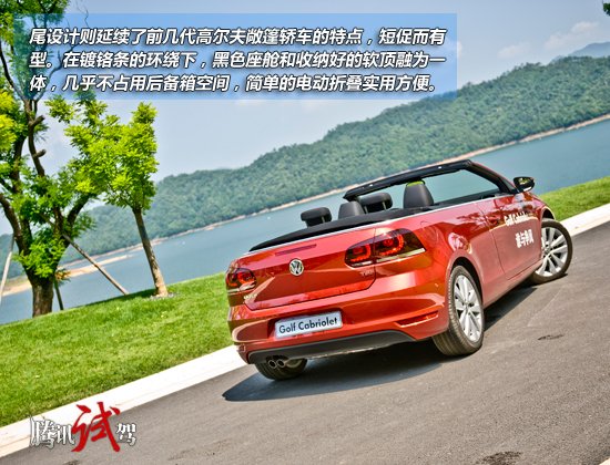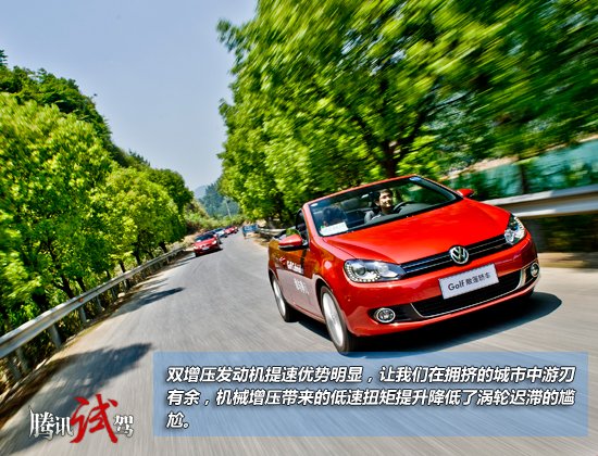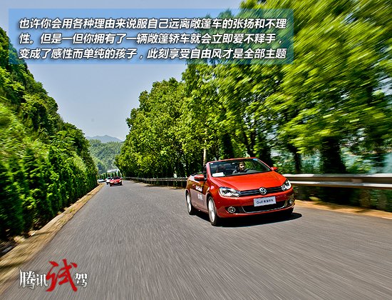 腾讯试驾大众高尔夫敞篷轿车 开惯了硬顶普通轿车的朋友们可能会觉得多花一倍的价格去购买敞篷轿车性价比不高,也许你会用各种理由来说服自己远离张扬和不理性。但是一但你拥有了一辆敞篷轿车就会立即爱不释手,变成了感性而单纯的孩子,此刻享受自由风才是全部主题。 打开敞篷,释放自由,迎接划破云层的阳光,你会发现呼吸是多么顺畅,感受吹动发梢的风速,此刻自由和你相伴,一切都魂牵梦绕,拥有一块属于自己的天空,体验与风竞速的驾驭快感,享受没有上限的欢乐。这是每一个感受过高尔夫敞篷轿车的人发自内心的声音。 9 {5 m5 G8 A( e+ U
