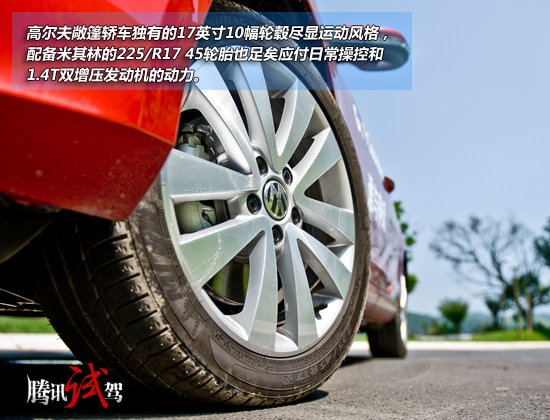 . w- O+ z5 }$ u+ u. q; ]; W腾讯试驾大众高尔夫敞篷轿车 高尔夫敞篷轿车独有的17英寸10幅轮毂尽显运动风格,配备米其林的225/R17 45轮胎也足矣应付日常操控和1.4T双增压发动机的动力。
