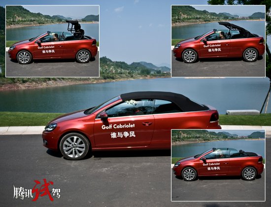 腾讯试驾大众高尔夫敞篷轿车 当软顶进行收纳时,标配的全自动电动液压顶篷10秒以内就可打开而关闭也只需11秒。