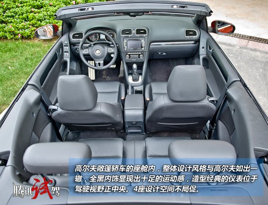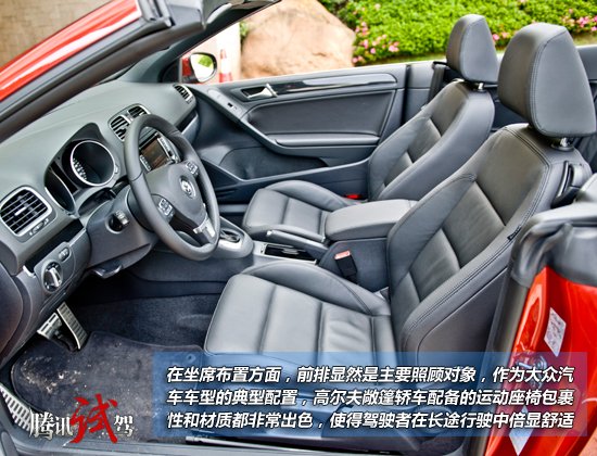 腾讯试驾大众高尔夫敞篷轿车 在坐席布置方面,前排显然是主要照顾对象,作为大众汽车车型的典型配置,高尔夫敞篷轿车配备的运动座椅包裹性和材质都非常出色,使得驾驶者在长途行驶中倍显舒适,而在激烈操控中也可以得到有效地包覆性和侧面支撑力。同时,驾驶员和前排乘客座椅具有“Easy Entry”方便进车功能,前排座椅腰靠,以及腿部空间、座椅高度、座椅和靠背倾角度都能随意调节。