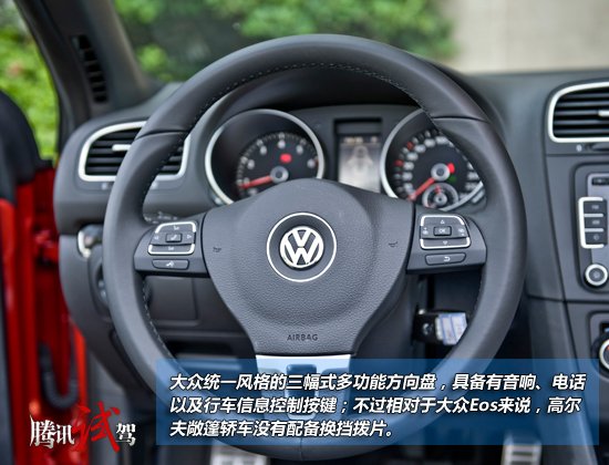 & F( q% z0 L/ G4 t# A腾讯试驾大众高尔夫敞篷轿车 大众统一风格的三幅式多功能方向盘,具备有音响、电话以及行车信息控制按键;不过相对于大众Eos来说,高尔夫敞篷轿车没有配备换挡拨片。