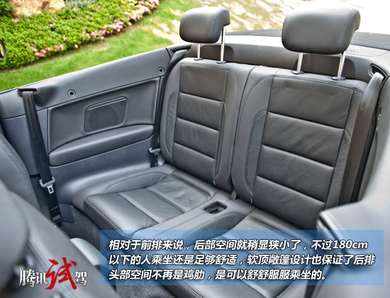 " a5 ^% O! }% o& o6 c8 j! I腾讯试驾大众高尔夫敞篷轿车 而相对于前排来说,后部空间就稍显狭小了,不过180cm以下的人乘坐还是足够舒适,软顶敞篷设计也保证了后排头部空间不再是鸡肋,是可以舒舒服服乘坐的。