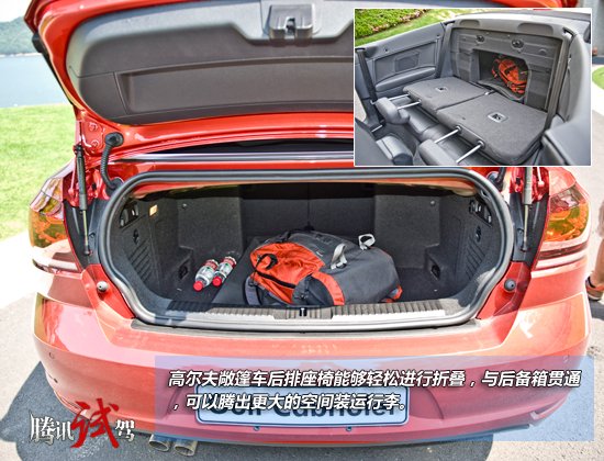 * {5 L+ Y7 ?% ^" ?8 j腾讯试驾大众高尔夫敞篷轿车 高尔夫敞篷车后排座椅能够轻松进行折叠,与后备箱贯通,可以腾出更大的空间装运行李。 在配置上,高尔夫敞篷轿车比较吝啬,37.98万的高配车型配备了定速巡航、双温区自动空调、ESP、“Park Assist”泊车辅助系统、大灯照明范围动态照明、膝部气囊等配置。一键启动、导航、换挡拨片以及科技含量稍高的自适应巡航、车道保持、盲区警示系统统没有。 3 }$ e5 b$ `( c* g0 d! a, [" W6 X