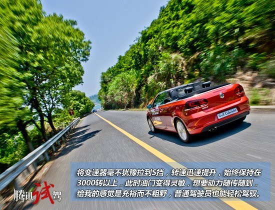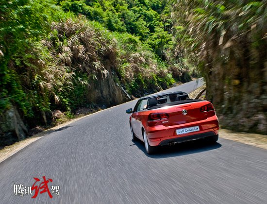 腾讯试驾大众高尔夫敞篷轿车 进入山区,收起顶篷,流转于盘旋的山间公路上,将变速器毫不犹豫拉到S挡,转速迅速提升,始终保持在3000转以上,此时油门变得灵敏不少,想要动力随传随到,给我的感觉是充裕而不粗野,普通驾驶员都能轻松驾驭,又可以得到不少快感, 听着山壁上反射回来的发动机声浪还有嗞嗞作响不甘寂寞的增压器,这种声音足以让人热血沸腾,驾驭的快感油然而生。米其林轮胎在山路上可以说是表现卓越,以时速70km/h攻急弯仍旧抓地力十足,同时配合麦弗逊前悬挂系统,四连杆式后悬挂系统的韧性调教,保证一定运动性的同时又兼顾舒适驾驶。特殊设计的高刚性车身确保敞篷结构车身过弯时依然稳健。