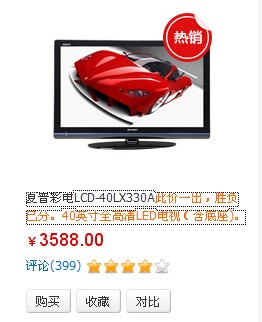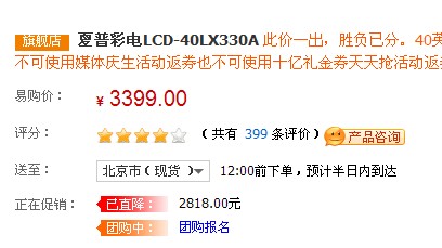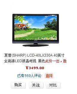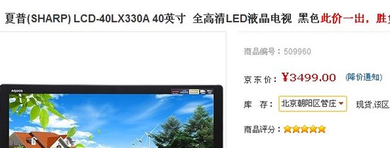 前方编辑在苏宁门店通过手机客户端现场比价:图为易购价格(腾讯科技制图) 腾讯科技后方编辑通过网上对国美在线商城、苏宁易购以及京东商城进行调查,随机选取夏普LCD-40LX330A液晶电视进行对比,发现国美售价为3514元,京东售价为3499元,而苏宁易购则是在9点55分至10点整至今对该产品价格做出了调整,从列表中的3588元降到了底层也显示的3399元。