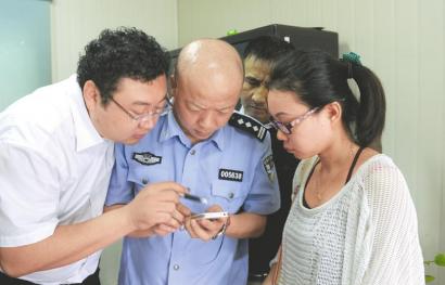 8月28日,成都康福德高出租车有限公司,失主和办案民警(中)一起研究翻拍的监控视频。