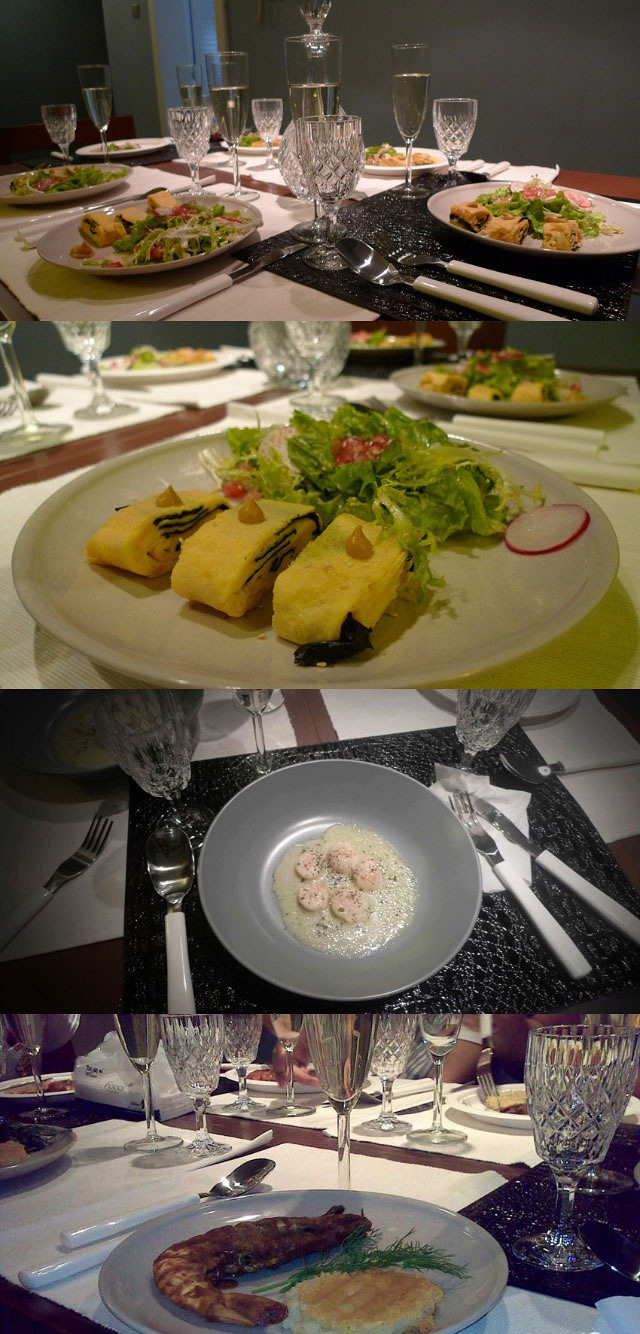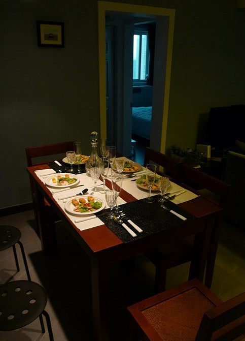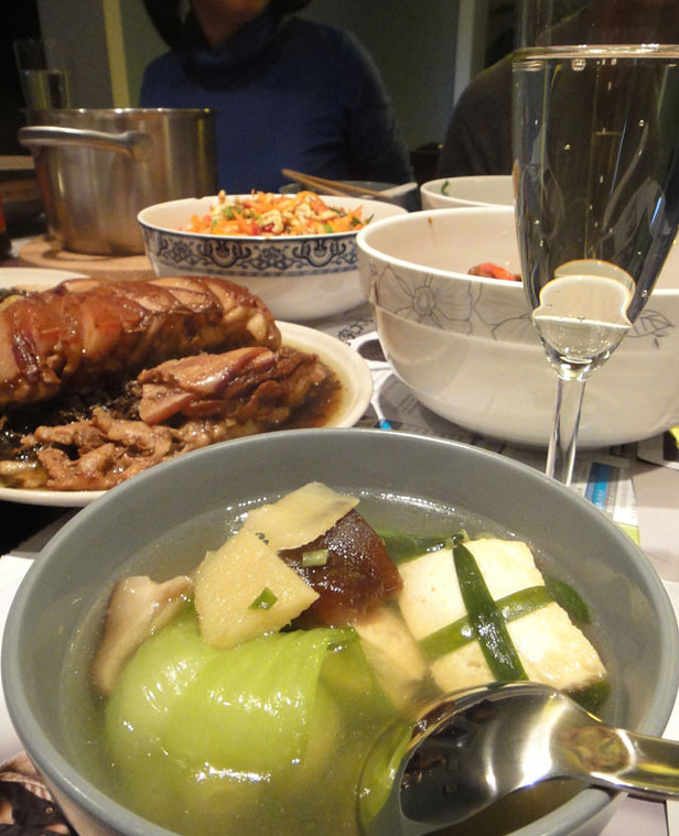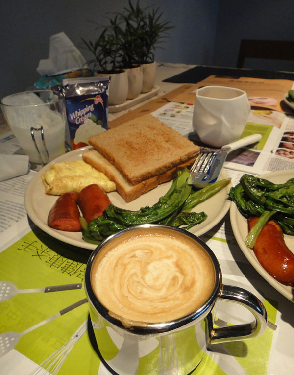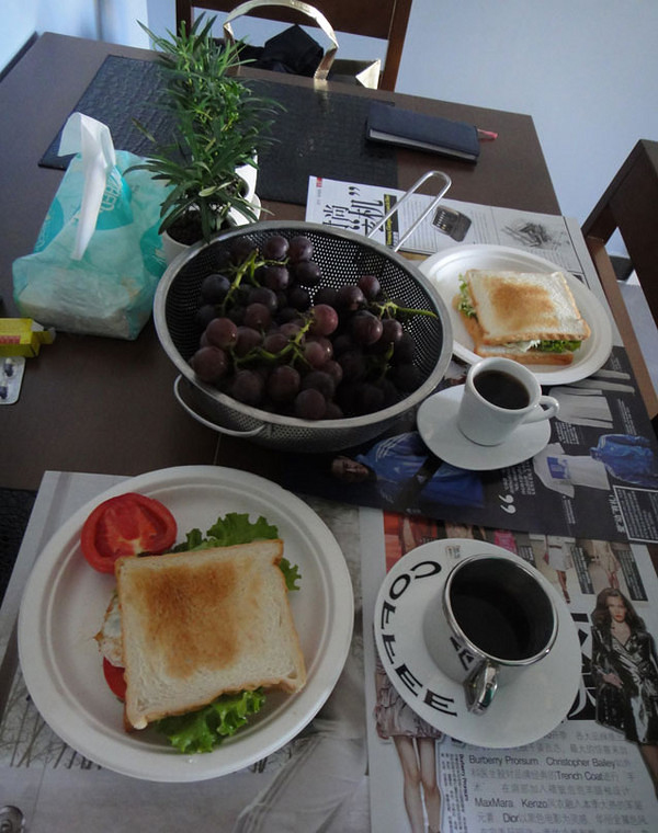 2 s# i8 Q' T9 w0 w" B8 Q搬进来后,第一次大请客是中秋节做西菜。主要是不想太麻烦,吃西餐,有4个菜就够了。西菜最重要的就是table-setting了。 第一道菜是海苔玉子烧配红醋芝麻菜,由于我暂时没想好用玉子烧应该用什么酱汁搭配,便用了非常不雅的黄芥末酱…… 有时候时间宽松,也有闲情就请客做中餐。露个真手吧。 从上到下:培根炒饼、豉汁焗鳕鱼、梅菜扣肉、小炒胡萝卜、辣子鸡、红油点豆花(自己做的豆花) 这是上面那只真手旁边那堆材料做出来的汤。山磨豆腐肉燕汤。 有时候实在不想做饭,就点外卖。其实吧,节日或者人多什么的,客人根本记不住吃什么,做什么给他们吃都白搭,酒管够就行。 天气不冷的时候,我一般会早起做早饭。我不愿意在外面吃,因为我巨痛恨味精和鸡精。早饭又很重要,所以自己做来吃时最放心的。 有时候黑咖啡配三明治 有时候奶咖配炒蛋香肠 |