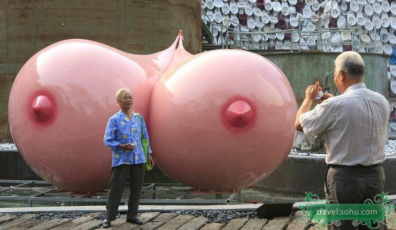首届中国(佛山)陶瓷节开幕,石湾公园内的“世界第一巨乳”吸引市民拍照留影。