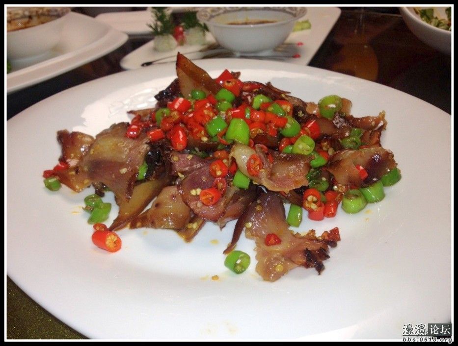 # f: Y& O- M6 [: I2 W7 A原汁原味的湘味,用松木熏的猪脸肉,有嚼劲,