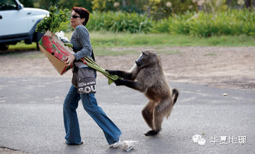 一只豚尾狒狒从买菜归来的妇女手中抢夺食物。栖居于开普敦附近的豚尾狒狒约有475只,它只是其中一员。