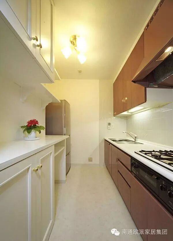 走廊式厨房是沿着两面相对墙建立两排工作和储物区。如果准备食物是厨房工作的重点,那么这种设计是一大优点。走廊式厨房不需要很大的空间,厨房尽头有门或窗即可。
