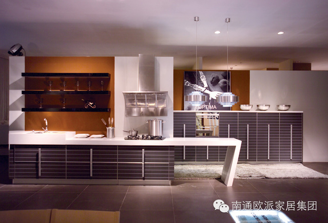 这种设计需要有很大的厨房空间。厨柜与厨房岛之间至少要有120cm的距离,以确保有足够的走动空间和柜门、抽屉开启的空间。厨房岛还可以用作上菜、吧桌或房间隔断。2 ^+ E6 G8 l; N+ h/ I