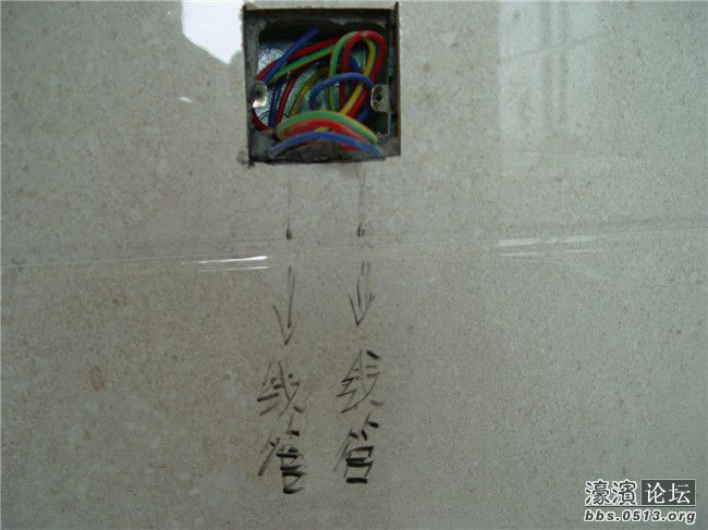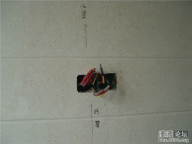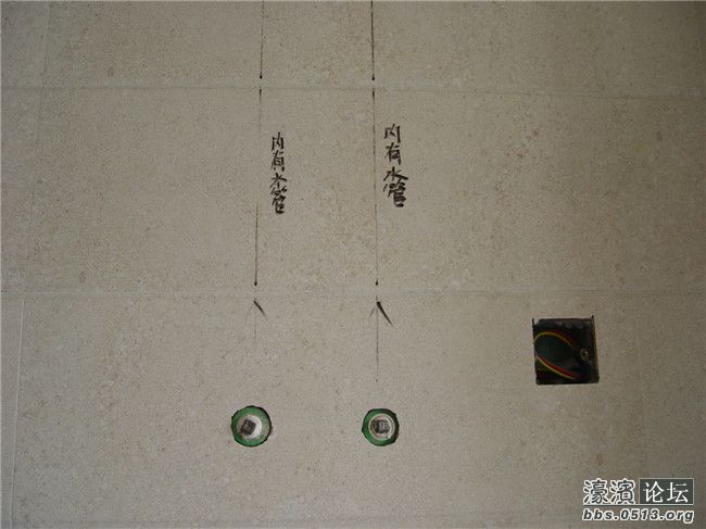 # P0 j( x! e# f; o% Y这是贴好瓷砖的墙壁上标注的水管标识,方便后期的施工注意到这些水管的分布,其实吧,楼主也看过很多装修日记了,似乎没有哪家装修公司会这样做,虽然说这是件很简单的事,但就是这么一个细节反应出装修公司的心思缜密,对每一件事处理的都是尽善尽美。( `8 {- X7 ?% Y$ l. g: {