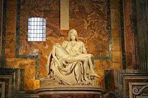 在传统的“圣殇”中,艺术家会用哭泣、充满皱纹的苍老脸孔,来强调圣母失去至亲至爱的痛苦。但是,在米开朗琪罗的《圣殇》上,圣母的面容却有令人难以置信的平静,甚至带有脱俗的稚气娇嫩。