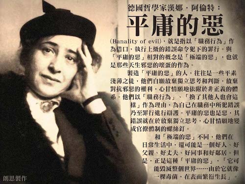 0 _4 I6 @, g: P7 j4 B7 W8 u52年前,汉娜·阿伦特在《纽约客》上发表系列报告《艾希曼在耶路撒冷:一篇关于平庸的恶的报告》。阿伦特说,这种恶就像表面蔓延的一层霉菌。它没有思考,因而缺乏深度。这就是平庸。只有善才有深度,才是根本的。