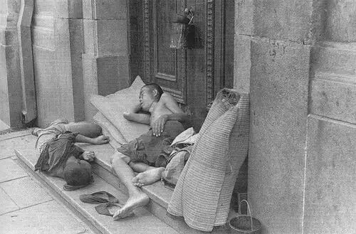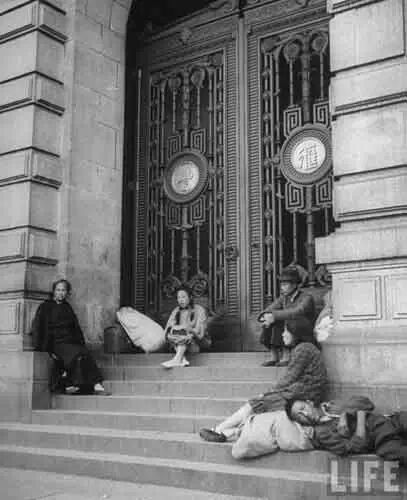0 R9 Q$ i7 v! d( f1 g7 @$ {△1945年上海,一个穷苦的家庭坐在关了门的银行的阶梯上。George Lacks摄。- s" ]7 l( N, a G2 P