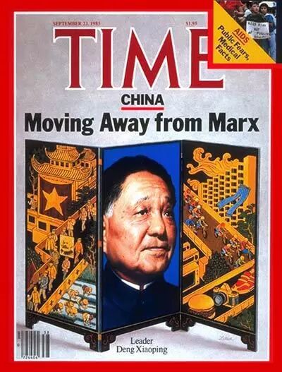 △1984年4月30日的《时代》杂志:“中国的新面貌, 里根将会看到么?”。一个普通的中国人手里拿着可口可乐,面露微笑,很直白的表现了中国正在开放,人们将要开始新的生活的景象。当然这也是对里根总统访华的一篇报道。