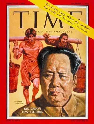: e q* b5 U$ x3 ~- K△1958年12月1日的封面,人物:毛泽东。封面的右上角引用了拿破仑的一句话,我们经常把它译成:中国是一头睡狮,醒来后她竟震惊世界。+ A1 j7 U3 X! d. f( K5 Q