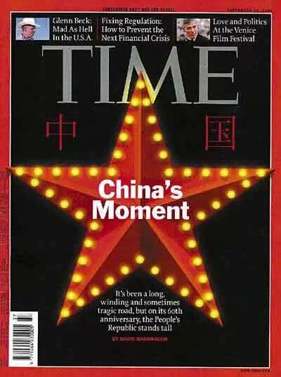 ) N( b) Z) d4 m5 j# o" D△原定2009年9月28日出版的美国《时代》周刊则于当月19日提前出版,“China's Moment(中国时刻)”躍然纸上,以鲜红的五角星作封面设计,美国媒体关注新中国成立60周年。" A' V4 D. [& p; i