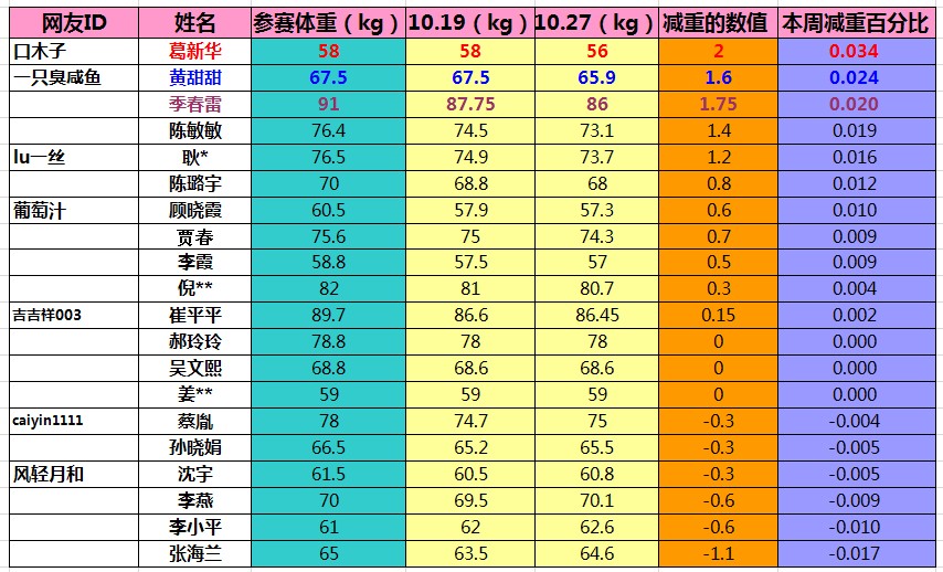 以上就是大家锻炼的靓照拉,通过两周的训练,到底有没有成果呢,一起来看看。第二周一共有20位童鞋参与pk,在此感谢大家的热情参与。 从总体减重情况来看大部分的童鞋还是瘦的比较明显的,但是本周个别妹子的体重又上升了,所以大家一定要坚持一起努力。