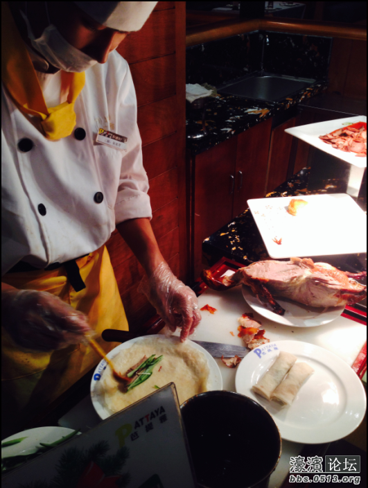 # a+ @- k- ]" v' g8 K, J' y这次的芭提雅自助海鲜试吃结束,总结一下,环境服务到位,菜品菜色很好,最喜欢的是那个北京烤鸭,口味相当NICE,看帅哥厨师帮我制作的春卷,现在想起来还意犹未尽呢!