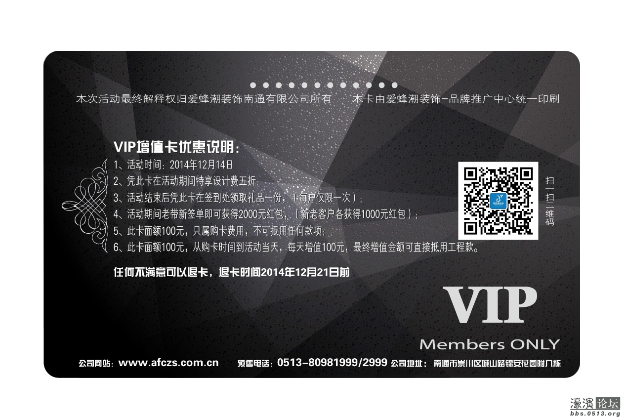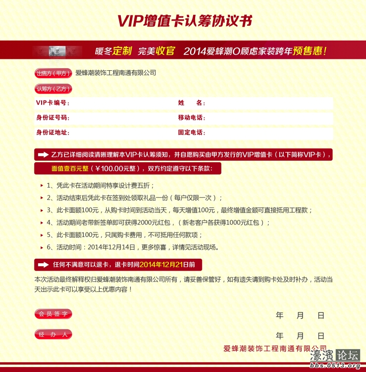 爱蜂潮跨年预售会重磅推出年度最大优惠力度,大牌设计费特享五折;即日认购增值卡到活动当天每天增值100元;活动期间老带新签单即可获得2000元红包,现场签订协议、预付定金更可参加现场 iPhone6 抽取活动。 1 g( F: Y2 E# k- v