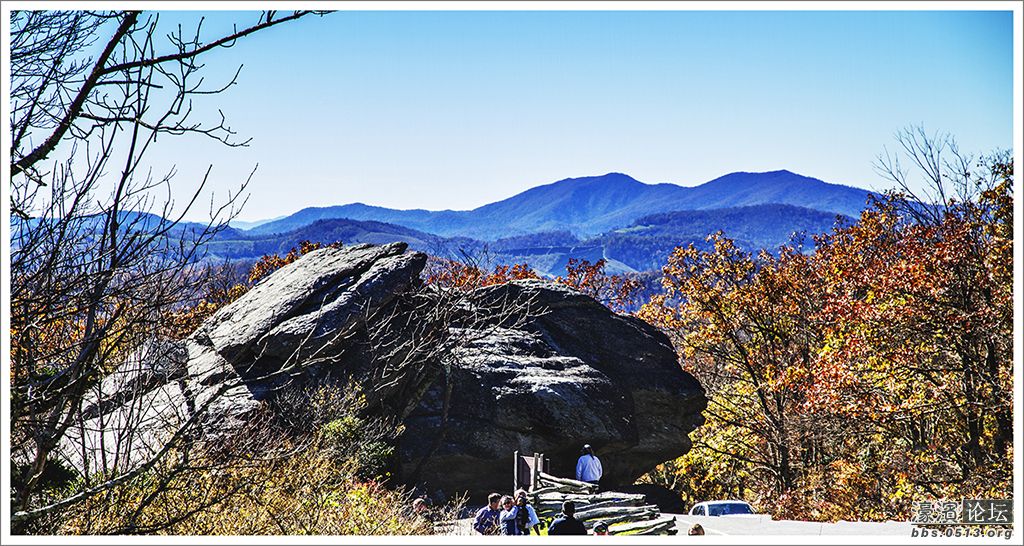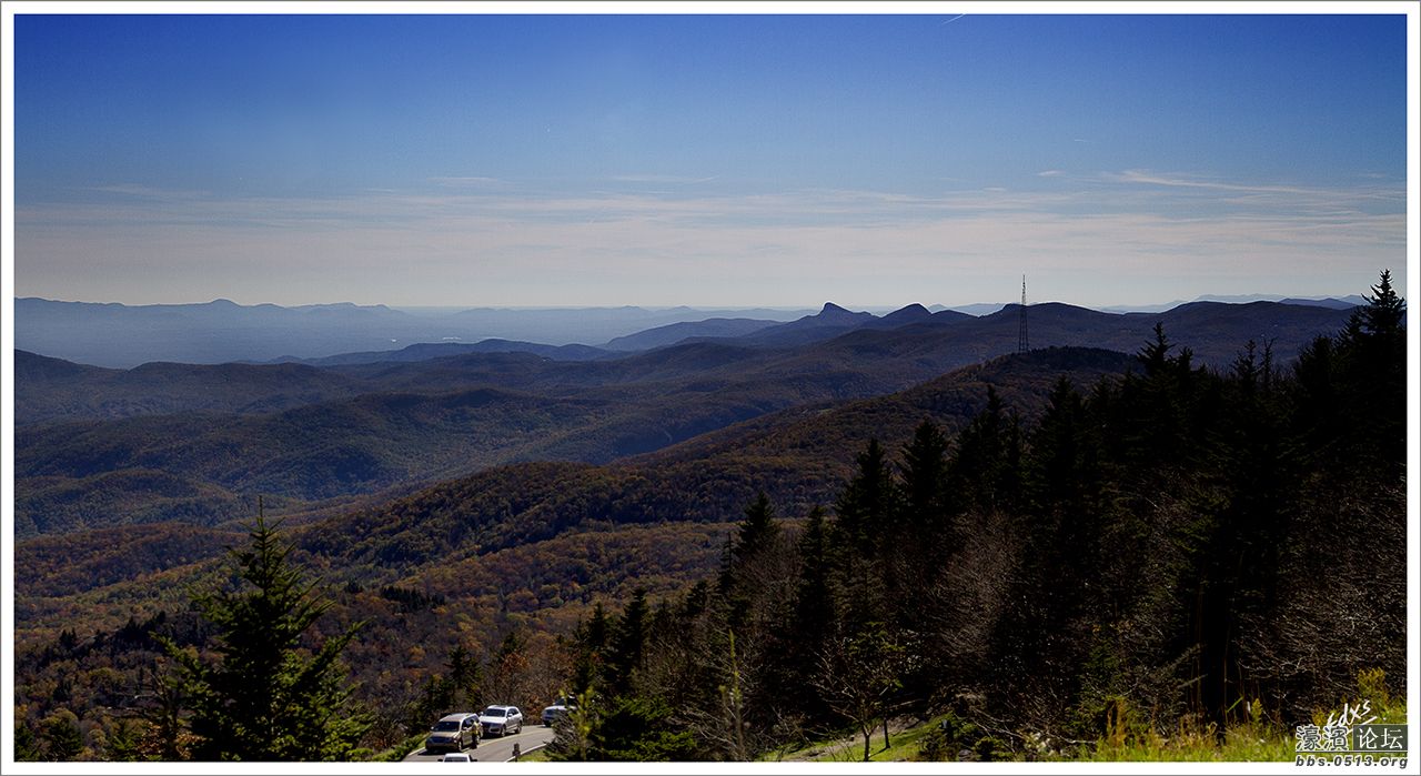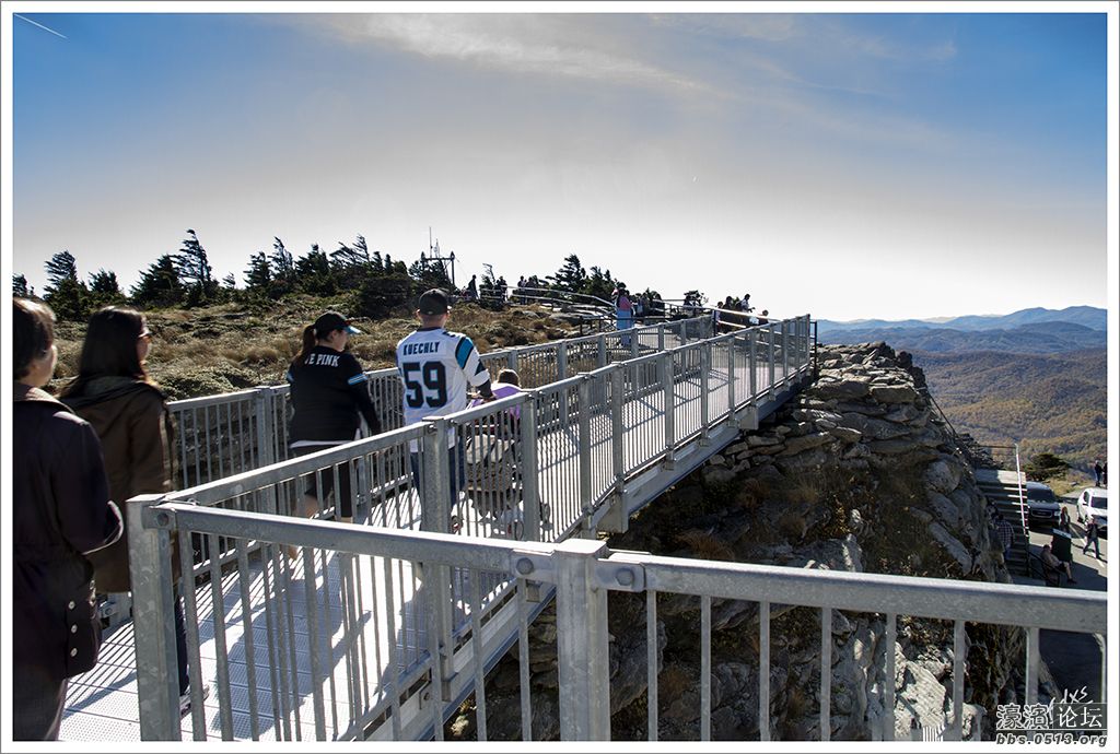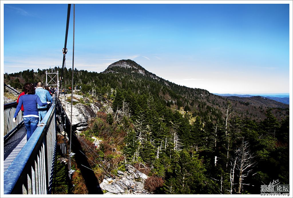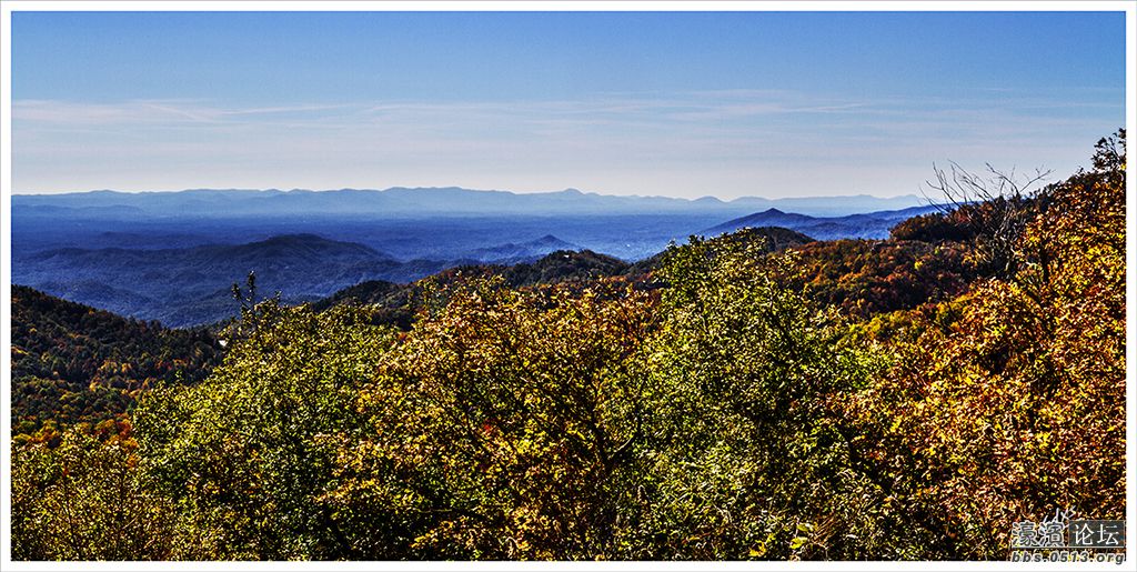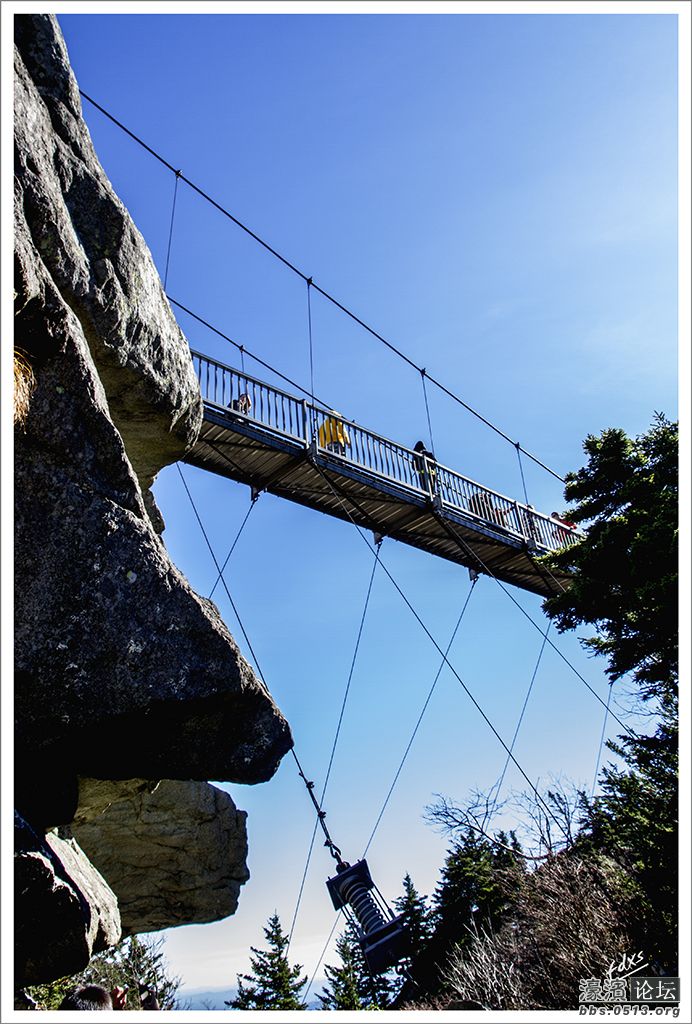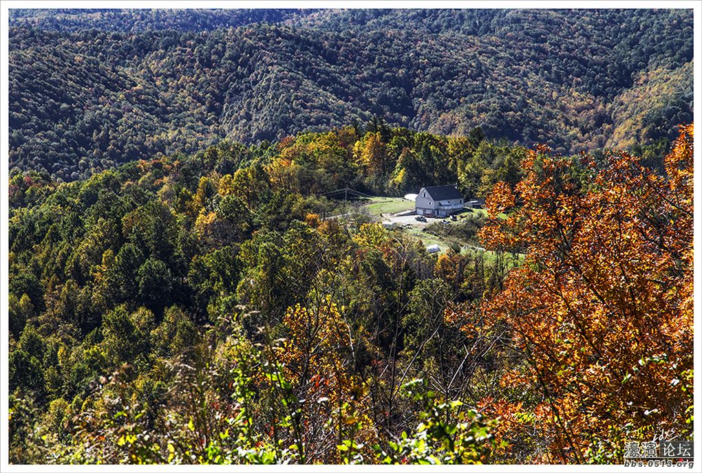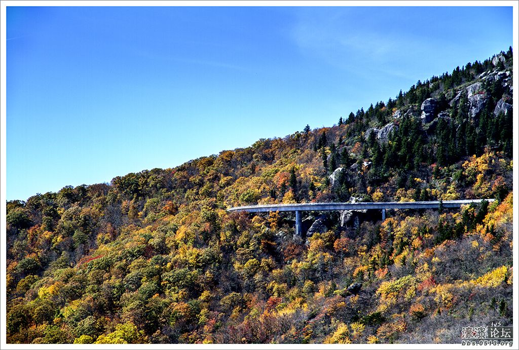 6 ?4 q* Z5 R7 R% B* ]* K老爷爷山(GrandfatherMountain)赏秋 秋天是北卡罗莱纳州最美的季节。每年的10月中至11月初是最佳赏秋时间。我们经不住美丽秋色的诱惑,星期天(10.19.)上午,我们驱车前往离我们居住地大约有四个多小时的车程的老爷爷山(Grandfather Mountain)赏秋。 汽车下了高速公路,进入山区,行驶在全美最知名的景观公路——蓝岭公路(Blue Ridge Parkway)上,窗外五彩缤纷,层林尽染,秋色迷人。可以毫不夸张地说,如果摄影技术还算可以的话,拿起照相机随手一拍,就是一张相当不错的明信片。 老爷爷山(GrandfatherMountain)是这儿众多山峰中最高的一座,这儿经常有獭、熊及美洲豹等稀有野生动物出没。据说运气好的话也能在公路两旁也看到它们的身影,但我们没那么幸运。 这山上还设有11条健行山道,有适合初学者的简单步行山道,也有高难度的攀岩山道,真是应有尽有。 考虑到我们的年龄、身体和时间等原因,我们没有选择从山脚步行上山,而是驱车直奔山上最高的停车场。 停车场旁有个小小自然博物馆,在这儿看到了在公路两旁没能碰到的水獭、黑熊、美洲豹和白头鹰等野生动物,也算是弥补了一项缺憾吧。 离开博物馆我们来到了最有名气的swinging bridge。这是一座架设在两个山头之间的吊桥。从下面看,桥很高很高,像是悬在半空中的一座独木桥,走在桥上,摇晃得挺厉害,风很大,有一种一不小心就会被刮下桥去的感觉,要过桥没有点勇气还真是不行。 在这儿居高临下,视野开阔,举头四顾,漫山红叶,在湛蓝的天空映衬下甚是壮观。无限风光在险峰,一种冲动迫使我一次次的按下快门,想留下这难得一见的壮美景色。 前一段时间比较忙,照片未能及时整理出来与朋友们分享,希望大家能喜欢。 有些片子由于受当时条件的限制,只能在行驶的汽车里隔着车窗玻璃拍,效果不理想。当然更主要是本人水平欠佳,照片远不能反映真实场景。还望朋友们多提意见建议,多多指导!