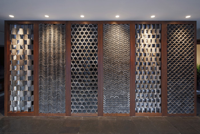 6 V7 l* H& K7 A8 b. _% J3京兆尹-餐厅室内设计我们尊重四合院建筑的核心元素 – 院。形成一个室外一个室内的两个院子空间的对比。 其它空间都围绕院子展开。从四合院中提炼取了木、砖、瓦等典型材料。目的是想达到传统和现 代的共生与结合。
