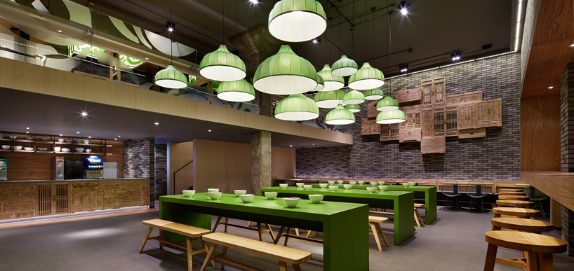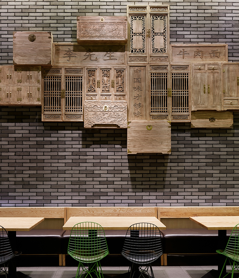 , B# o& y& r" d1 ? f6充满了中式味道的李先生牛肉面馆不同于以往红色系的李先生门店,这套以绿色为主色调的装饰让李先生加州牛肉面的门店充满了中国的味道。设计师期待透过这家新形象店来述说李先生的这段历史,从中国到台湾,再去了美国,世界转了一圈最后回到中国。
