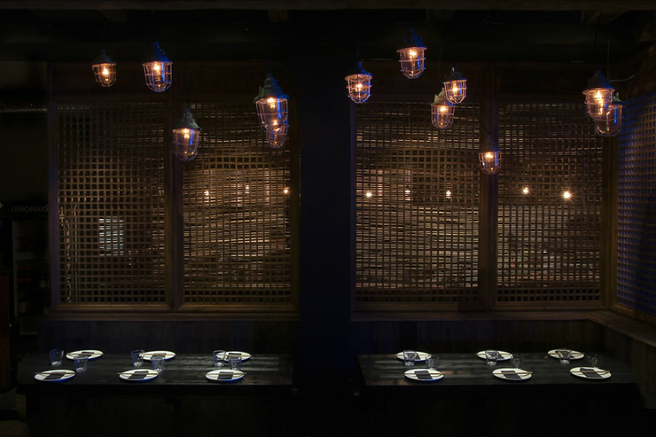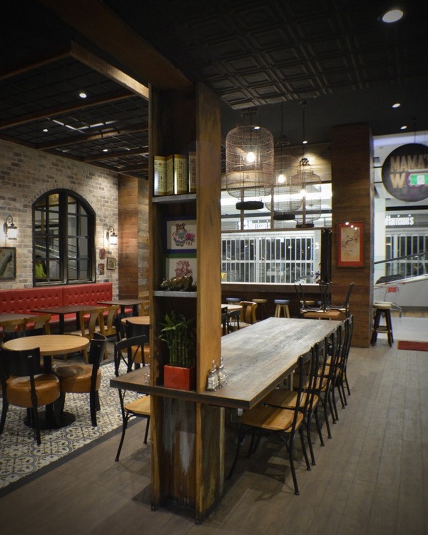 & W8 P: @4 ^+ k" V W* f7Mama’s Wok 悉尼中式餐馆室内装修设计说到中式 Mama’s Wok 店内的环境除了朱红色的木窗隔断和家具外还用灰色砖墙和鸟笼子造型的灯罩进行了装饰,虽然里边还有一部分洋玩意儿但整体的布置和装饰让室内充满中式的调调格外吸引外国友人前来就餐。" W6 K7 k. s9 W8 [