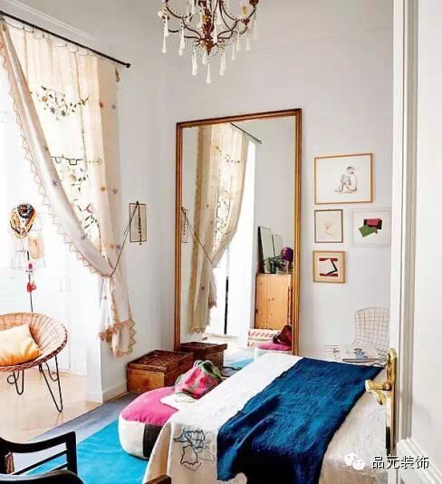 ▼在朴素中添加细节 不是个很大的卧室,但一面巨大镜子让空间豁亮很多(风水论者绕行);整体朴素的空间,一个稍显华丽的吊灯反倒有几分分寸得当的味道;窗帘的挂法很优雅,比全部拉开更有味道;几块鲜艳色彩的布毯坐墩,很好的点缀了这个大白墙清淡空间。