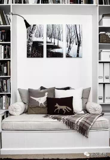 4 u, c5 Q: ~, H: ]8 ?▼书墙“抠”出阅读角 书墙中“抠”出了一块阅读区,很有味道很舒服,大量使用靠垫也是技巧之一。 3 ^& c2 p+ n1 p7 l! f