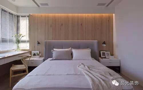 ▼卧室里的搁板桌 超舒适卧室,左边沿窗做搁板桌,宽约3米的木板墙让整个空间立刻自然清爽,注意与地板色协调统一,灯池的造型很简单,并不是复杂的吊顶。 " ^# J7 e* y" S: h% z7 H9 e W
