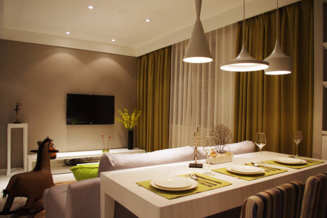 餐桌上方具有设计感的吊灯为这一空间提供了温馨的照明。 在整间屋子,我们都以装饰画或是照片墙的形式来装饰墙面,让屋子中的墙面看上去不会显得太过单调。