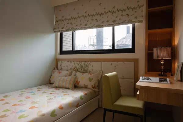 这间屋子也同样以简约风格呈现,能够放下一张舒适的小床和一张实用的书桌来实现阅读功能,与木质书架联体的书桌让这一空间很具整体性,床头的黑框大窗户给这间屋子带来不错的天然采光。