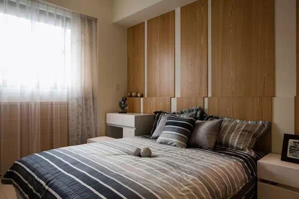 主卧中以木质板材拼贴的样式来作为这间卧室的背景墙,靠窗的床头边放置了一个小小的简约梳妆台,便于平日可以在这里梳妆打扮,这样的一个小空间对于我们这样的小户型婚房来说也已经足够了。