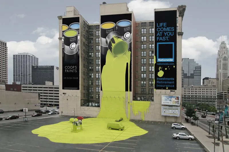 0 [0 N/ G& w9 v, S/ }+ f保险公司广告:视觉效果极佳的一则户外广告。这则广告很容易让人误以为是油漆广告,但其实是Nationwide insurance的原则保险广告,灾难总是在无意中瞬间发生,无法预知,还是买份保险吧。