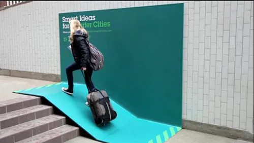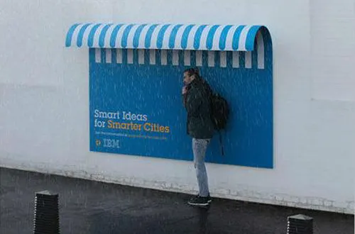 IBM的功能性户外广告牌:打破传统户外广告的设计思路,加入更多功能性元素,将死板的广告牌打造成了避雨亭、长凳和无障碍坡道,充满了浓浓的人情味。广告主题“Smart Ideas for Smarter Cities.”。 2 `$ Z/ @/ w0 F' _; d
