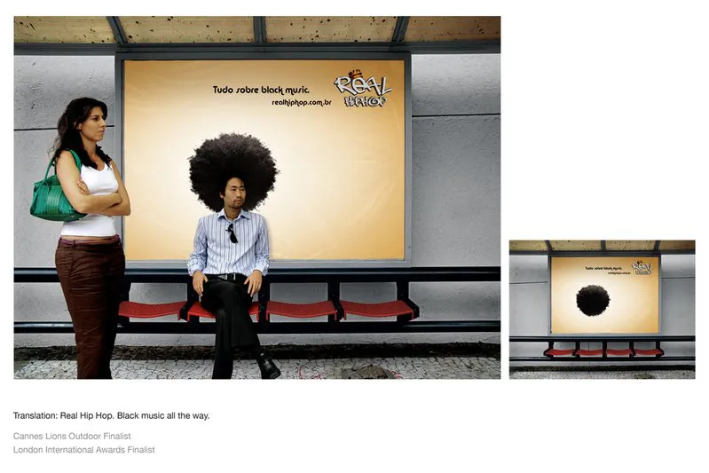 0 u- d( U+ H5 z! K5 @2 ZReal Hip Hop广告:在公交站台上制作了一个黑色的发套般的图案,当有人坐上去的时候,喜感立即蓬勃而出。很逗趣的一则设计。 " \! J' p& V7 E; l% @3 U( J: J/ M