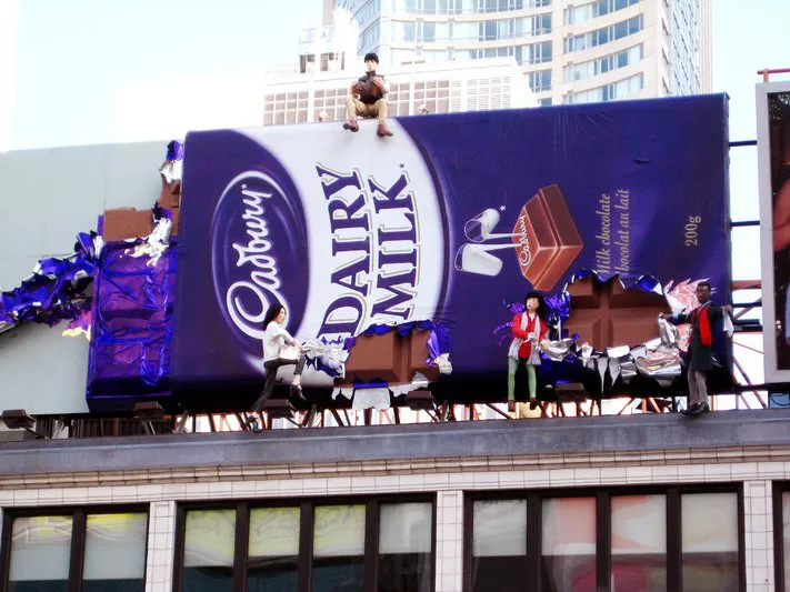 牛奶巧克力广告:人们迫不及待地要拆开包装,一尝牛奶巧克力的美味!