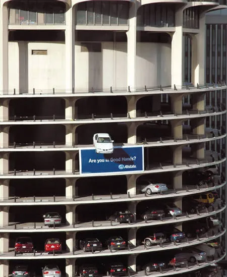 . I5 U7 L0 @2 H& ?+ D; l' d4 r这是为好事达汽车保险做的广告,将一部真实的汽车悬挂在芝加哥市中心着名的地标建筑MarinaTowers车库的边缘,摇摇欲坠。如此危险,还是买保险吧。