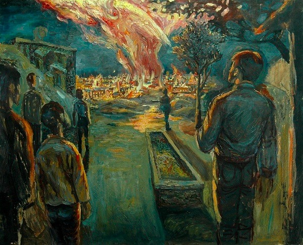 $ Y! n6 `9 Y+ F4 }8 O) f. p我加入到一个波西米亚式的流浪表演艺术工作者队伍当中,一天晚上我们来到了一片北方黄土高原上的城市社区附近,那是我曾经居住过的地方,由大片大片的平房住宅组成,保存着熟悉而温暖的生活记忆。今晚不知为何它整个燃烧起来了,大约全部居民都已撤离,但所有的建筑结构都无可逆转地越烧越旺,无数狂热的火苗激动不已地蹦跳、旋舞,尽情吞噬着它们所能够得着的一切。渐渐地火苗们汇成了越来越宏伟壮丽的通天大火,足有几百米高,凤凰涅磐时点起的大火,有这样的色彩,却没有这样的气势 。我和同伴们在一起,边向后撤离,边仰头如痴如醉地观望。大火仿佛点燃并激活了时代,将它转化为巨大的光能与热能。后来,夜的黑暗重重地降落下来,掷地有声 ,却依然掩盖不了火的伟大。巨大的痛快与恐惧,同时深深浸入我的心田。