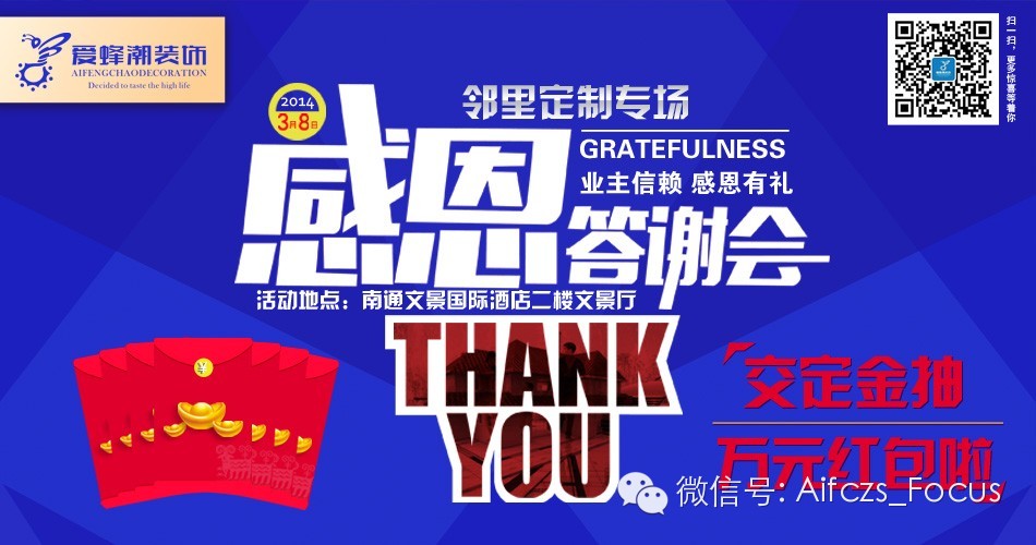 3 M6 _9 L& t4 [' r6 n 小编语3月8日,南通文景大酒店,爱蜂潮举办2015年“邻里定制”业主感恩答谢会第一场活动,虽然天空下着蒙蒙细雨,但依旧挡不住业主的热情,现场交订金的客户除了精美礼品相赠,更有机会抽取万元红包大奖~感谢业主的光临! 活动内容