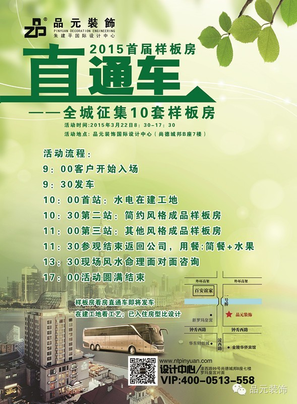 活动详情 【主办单位】:品元装饰国际设计中心 【活动时间】:2015年3月22号9:00~17:30 【活动地点】:一号桥南50米路东濠西路99号尚德城邦B座7层 【活动主题】:品元装饰2015年首届样板房直通车 【活动对象】:所有通城业主 【预约热线】:13813711964 【在线预约】: