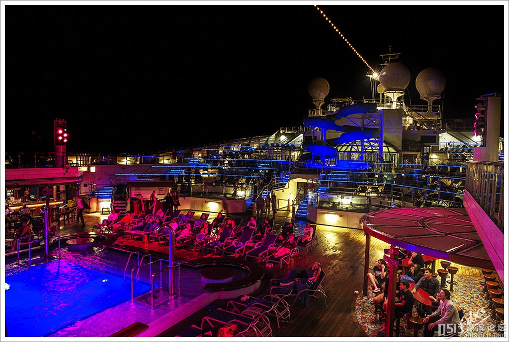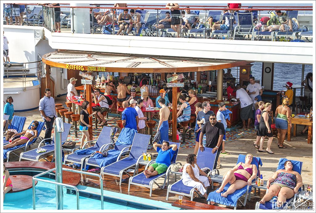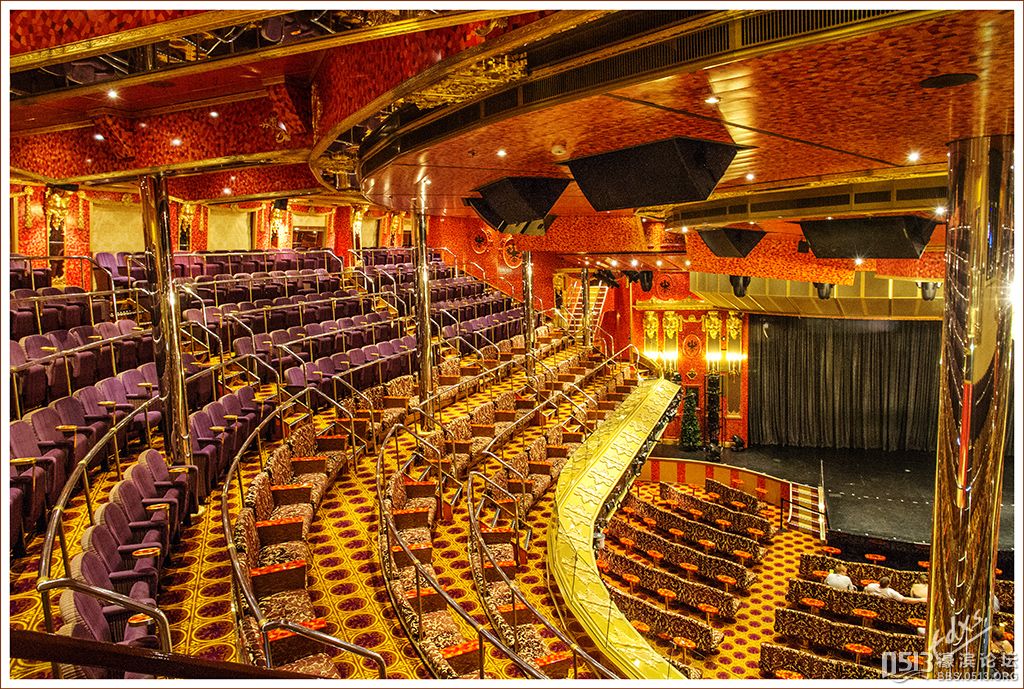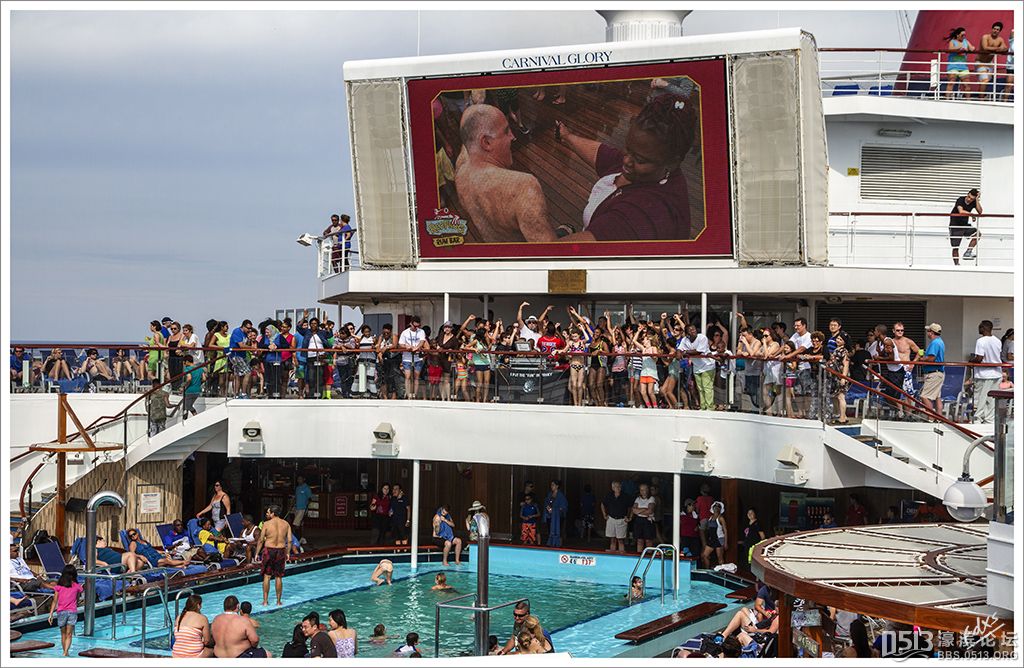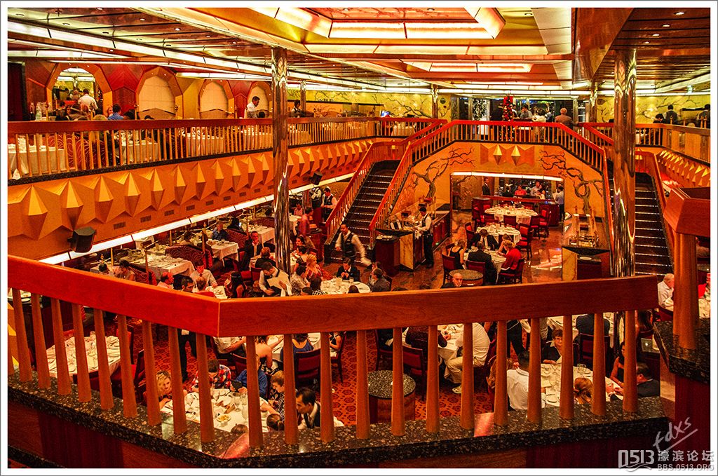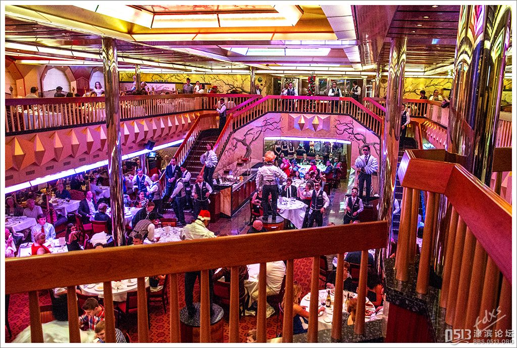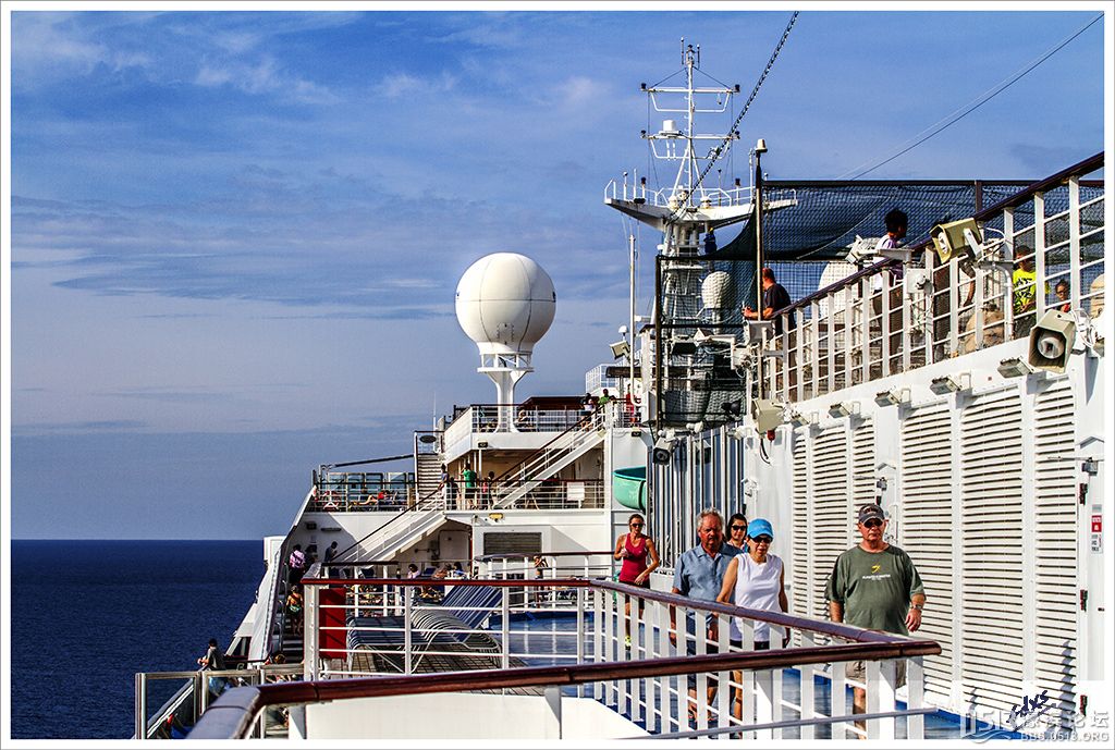 嘉年华光荣号(Carnival Glory Itinerary)邮轮 傍晚时分,嘉年华光荣号(Carnival Glory Itinerary)准时起航了,开始了为期一周的海上旅行。预计邮轮将在海上连续航行一天两夜,第三天的早晨才到达这次旅行的第一站墨西哥的科斯塔玛雅。 我是第一次乘海轮,对船上的一切我都感到新鲜而有趣。 长时间乘船会晕船吗?整天呆在船上会感到寂寞吗?嘉年华光荣号邮轮究竟有多大?穿上有哪些设施?能满足来自世界各地不同肤色不同年龄阶段的人们的不同需求吗? 带着这一个个疑问,开始了认真的考察。 嘉年华光荣号(Carnival Glory)是有史以来最大的客轮之一,以卡那维尔港为母港。嘉年华光荣号排水量11万吨,总长度952英尺,甲板楼层14层,可以容纳2974位乘客,在游轮的1487间客船舱中,大约60%为海景舱。 邮轮设有22间酒吧和酒廊,一个15000平方英尺的健身房,4个泳池、3间餐厅,其中包括一间高级“牛排馆风格”的超级美食会所。嘉年华光荣号是真正的“海上度假村”,可为客人提供范围广泛的用餐、跳舞、娱乐场所以及网吧、慢跑道、排球场、微型高尔夫球场、乒乓球活动场所、理发厅、照相馆、托儿所、会议中心以及购物及时尚精品大街等应有尽有。 嘉年华光荣号的船上用餐选择将包括两个两层的全套服务餐厅,泳池旁边有一个面积很大的两层自助餐厅,供应便利的早餐、中餐、晚餐,此外还有一间糕点店和日式寿司料理吧。 嘉年华荣耀号的每一个活动场所都被标上了吸引您的颜色,就如绿色运动场中的翠绿色的牛排餐厅,蓝色的茶餐厅,黄色赌场俱乐部,火红的勃艮第酒吧。 金碧辉煌的豪华餐厅,不仅可以讨好您挑剔的胃,而且令你想不到的是,常常在餐中会突然响起音乐,所有服务人员会穿上各式服装站在楼梯上、过道里、甚至跳到预备餐台上为你表演欢快的集体舞蹈。 嘉年华光荣号的四、五层有一个不算很小的剧场,每天晚上都有两场精彩的演唱会或其他演出。位于五层中部的赌场规模不是十分大,但不管白天还是夜晚总是座无虚席,吸引了不少爱碰运气的人。船的九层甲板中部,有一个较大的室外海水浴场,在这儿每天聚集的人最多,这儿充满乐趣,不仅可以享受到露天海滨浴场应有的愉悦,还可以自愿即兴参加各种有趣的激情四射的集体游戏等活动。 一天多我除了吃饭和睡觉就是拿着相机在船上到处转,到处看。我转遍了船上14层甲板的所有地方。可以毫不夸张的说,除了严格禁止游客入内的地方我都去过,一般都去过两三遍,拍了一些照片,现在上传与大家分享,希望大家喜欢。当然也欢迎拍砖。 % ]+ \4 D. t# z' ?0 J* P6 f