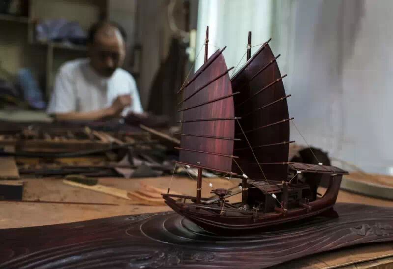濠河边长大的朱宇, 幼时目睹船来船往的盛景, 让他形成浓郁的“恋船情结”, 于是他选择用刻刀再现船之意蕴。 他昼夜挥刀不已, 创作出“郑和下西洋”、“凤船”、“鸦船”、“帆船”、“渔船”等系列舟船作品。 作品一经推出, 立即引发世人赞叹, 誉之“江东船王”!
