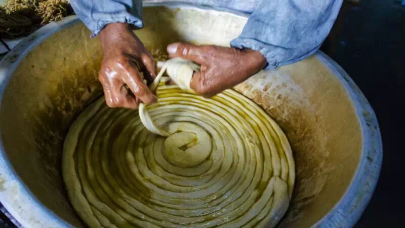 和面、发面、擀条、油浸, 将面搓成各种形状, 放入滚热的油中煎炸, 直至炸成金黄色, 虽未添加一点辅料, 但已足够垂涎欲滴。