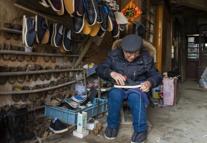 秦少游的词句稍加改编, 来描述余西古镇上的布鞋匠, 怕是再合适不过了。 照片上这家鞋店已有六十年光景,