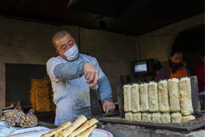 照片里的这家油条铺子, 已有四十年之久。 年迈的老板仍亲自动手, 炸出的油条色灿若金,香飘数里。