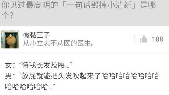主持人:一个男人三条腿,两个男人五条腿请问是为什么?答题美女羞红了脸,欲言又止(心道:五千元奖金和形象哪个重要。):走后门吧!!十秒后主持人说道:不对,是拄拐的盲人背后搭着个盲人。